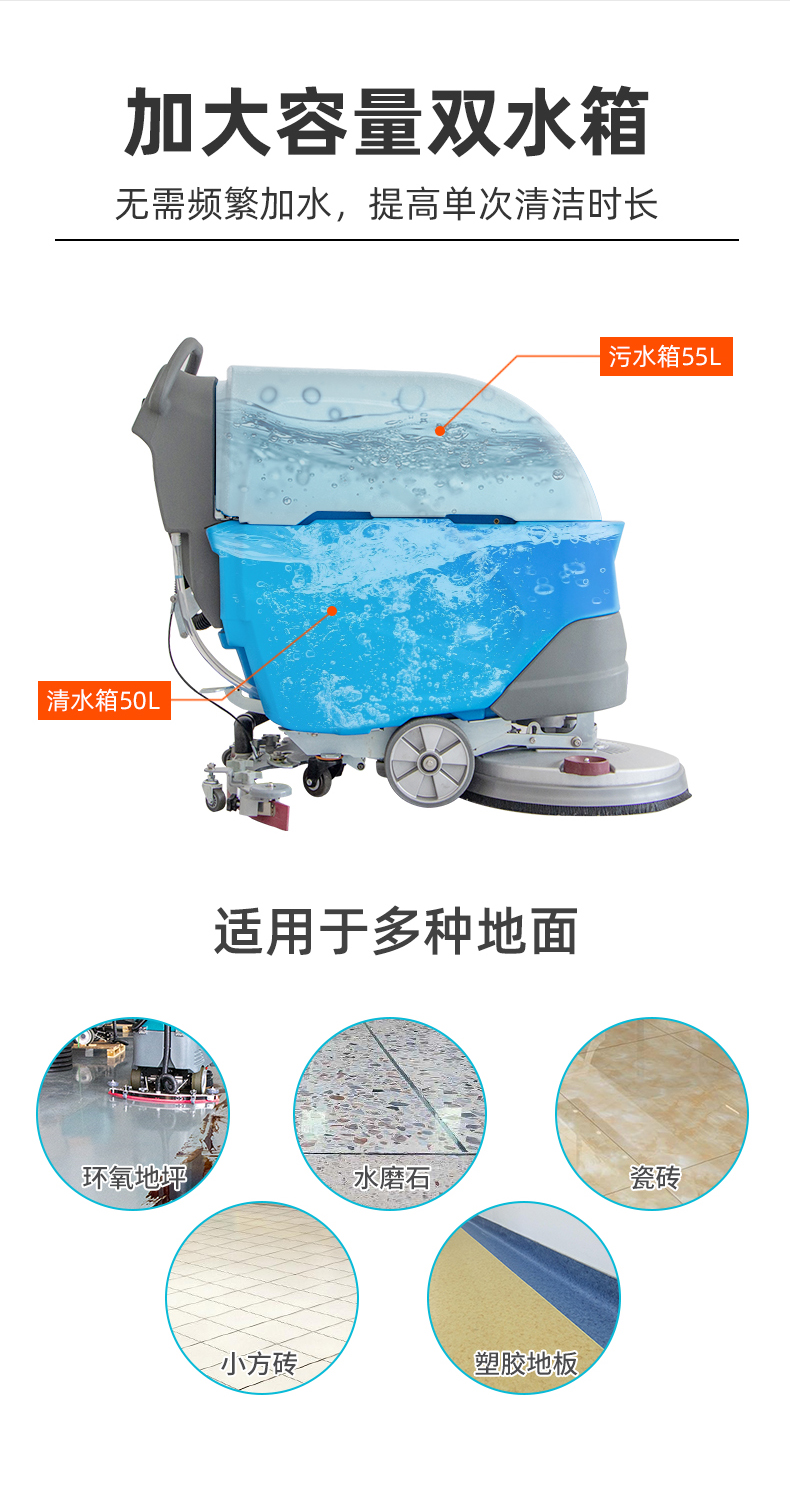LT-M2型手推式工业洗地机,工作效率2300㎡/h,清洗宽度530mm,吸水宽度800mm,电池容量24V/100Ah,采用大功率品牌电机,广泛用于工厂、车间、医院、商场、机场、地下车库等场景,洗刷吸三合一,去污不留痕,充满电可以连续工作2-3小时,适用于6000㎡左右的工作场地。