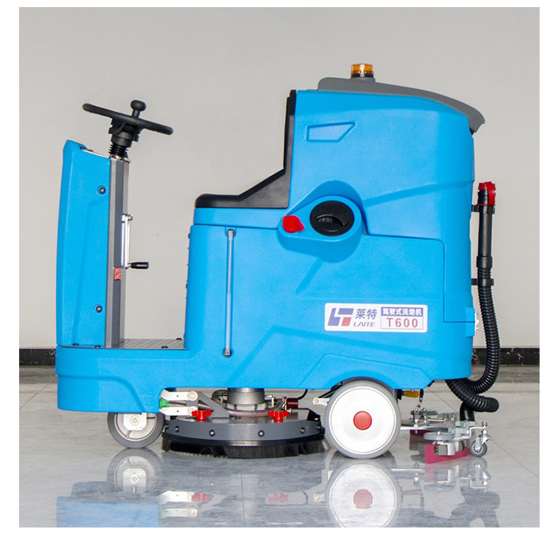 莱特工业洗地机T600型,机身尺寸:1370*800*1300mm,吸水扒宽度:1000mm,额定电压:DC24V,工作效率:3600m²/h,标配电池容量:100A,连续工作时间:3-4h,工作宽度:530mm,刷盘转速:150rpm,刷盘功率:550W,吸水功率:600W,行走功率:1000W,行走速度:0-7km/h,清水箱容量:90L,污水箱容量:100L,声级:60dB(A),整车重量:201kg。具备:全自动升高和降低刷盘、吸水扒;倒车自带吸水趴和刷盘升降功能;污水箱满了自动停机功能;配有水量显示器,可直观观察水位变化;电磁刹车装置,坡道上停车时不会溜车,更安全;采用双控制器系统控制整车电控,维修简单快捷;浮球滤网+传感器双重保护设计可防止污水进入真空电机;更轻便小巧,适用于较小的场所,可直接进出电梯,方便清洗不同楼层;两个注水口设计:大注水口可实现快速注水,小注水口适用于远距离注水;污水箱易清洗。静音设计,适用于对声音敏感的环境,如办公场所,医院;吸水扒易装卸,遇到障碍物时自动脱落,可保护吸水扒,帮助机器顺利通过。